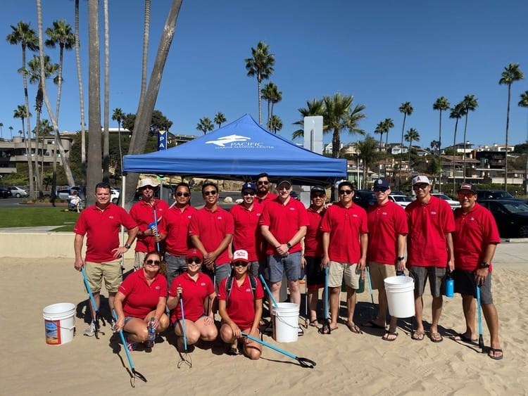 Kia volunteers helping the Pacific Marine Mammal Center clean up a beach.