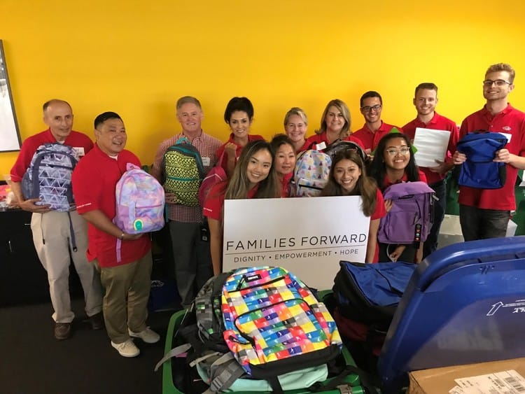 Kia volunteers at Families Forward helping to stuff backpacks with supplies for Back to School.